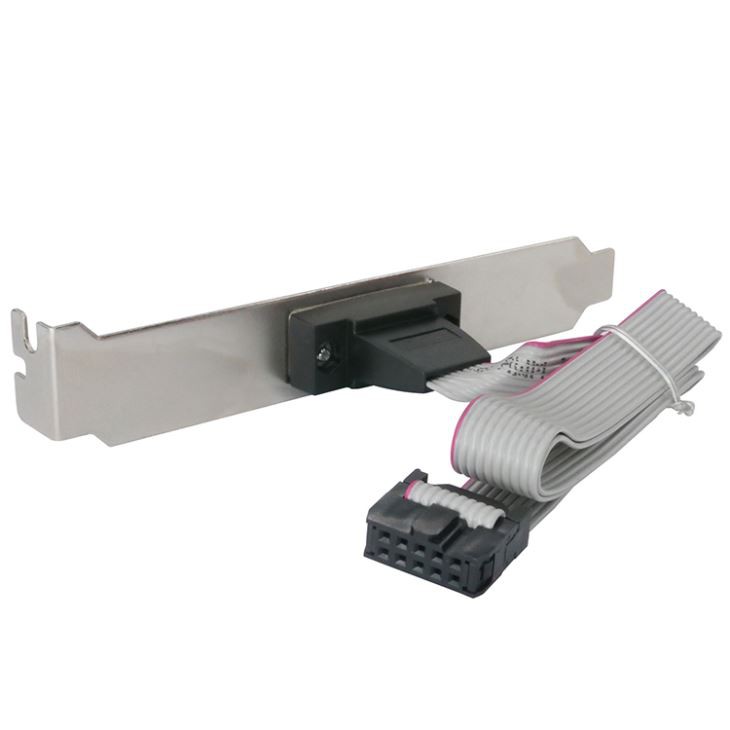 Käynnistä DB9 uros - IDC 10Pin naaraskiinnike nauhakaapeli. Se on myös nimeltään DB9 Male to IDC10 Serial Port Everex -kaapeli kiinnikkeellä. Se on valmistettu laadukkaista komponenteista kestävyyden ja luotettavuuden varmistamiseksi. Kiinnike yhdistää 2,54 mm: n nousun Serial Port -tapin otsikot, ja mukana tulee irrotettava täyskorkeus, ura-asennuskiinnike, jos rungossa ei ole aukkoa samalle.